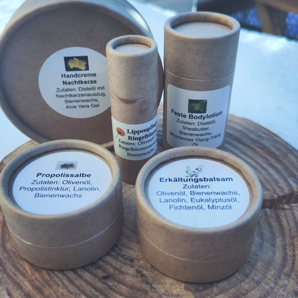 Stelle in meine Kursen Cremes, Lotionen und Peelings aus frischen Kräutern und Blumen her.